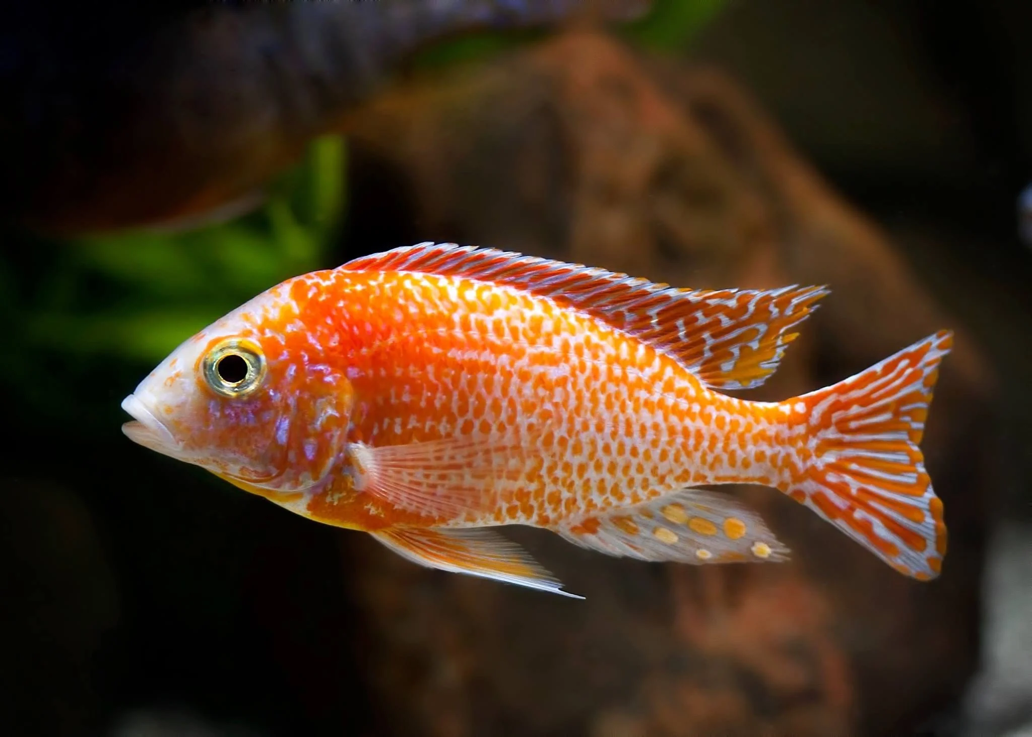 Remarks: The dragon blood peacock, or fire fish, is a hybrid, but its origins are unknown. They show a remarkable variation in color and pattern with the German strain we currently breed typically being a more pinkish-orange color. Please note that males under 4" may not show much color, but they typically develop a tremendous amount once they settle into their permanent tank. Some fish will have spots as well, which likely came about from breeding at some point. We cannot guarantee the density of spots, though the fish labeled as "Black Spots" will have a higher density. Some normal males or females will contain spots.